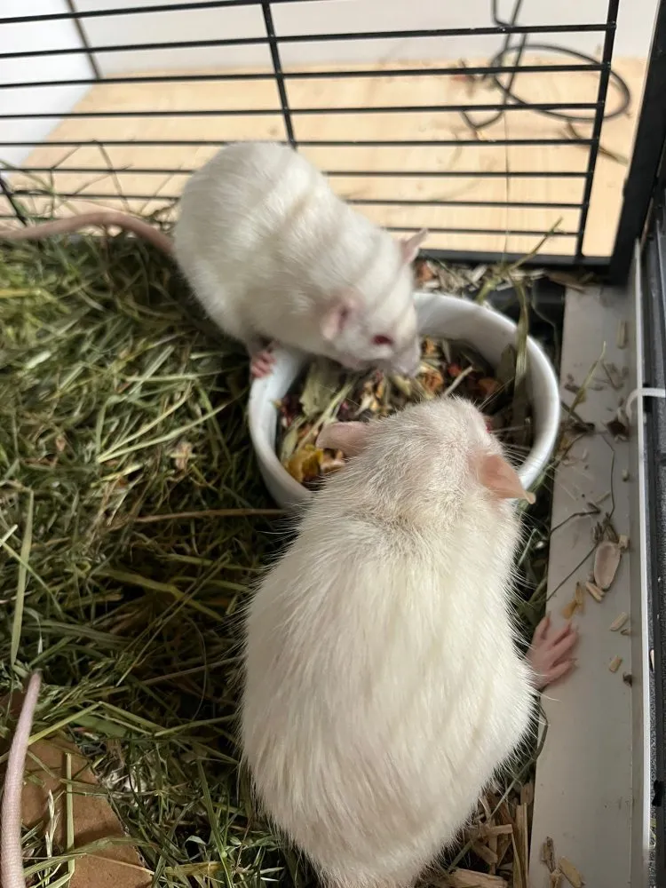 Die beiden Rattenmädels (geboren 07.2025) suchen zusammen ein artgerechtes Zuhause. Anfangs sind sie etwas schüchtern, aber das legt sich, wenn sie Vertrauen gefasst haben.